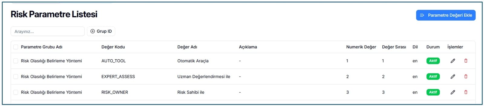 “Risk Parametreleri ekranı, risk analizlerinin temel hesaplama değerlerini belirleyen stratejik bir yapı taşını temsil eder.