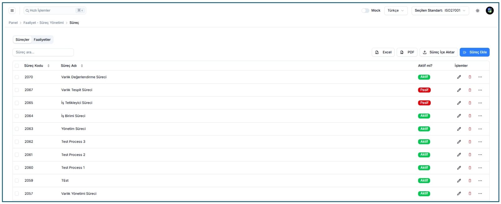 Her süreç; kodu, adı, faaliyet sayısı ve aktiflik durumu ile birlikte düzenli, okunabilir ve yönetilebilir bir şekilde sunulur.